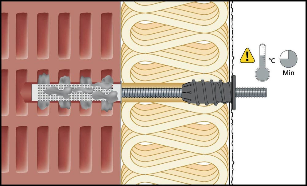 für schwere Abstandsmontagen in WDVS gedämmten Fassaden geeignet, z.B. zur Überbrückung von Dämmstoffdicken von 60-220 mm bei der Verankerung in gedämmten Fassaden aus Beton, von 60-190 mm in Porenbeton oder Vollstien und 60-150 mm, wenn die gedämmte Wand aus Lochziegeln besteht · das schwarze thermische Trennmodul eliminiert effektiv Wärmebrücken und schützt vor Schimmel und Wärmeverlusten · vormontierte, witterungsbeständige EPDM-Dichtung gewährleistet sichere Abdichtung gegen Schlagregen bis zu Windstärke 11 (orkanartiger Sturm) und bis zu 3 mm Verschiebung · geprüft nach DIN EN 12155 · Anwendung: für Vordächer, französische Balkone, Satellitenschüsseln, Klimageräte usw.