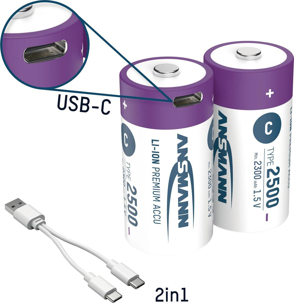 2x Baby C Li-Ion Akku 2500 mAh, 2 in 1 USB-C Ladekabel