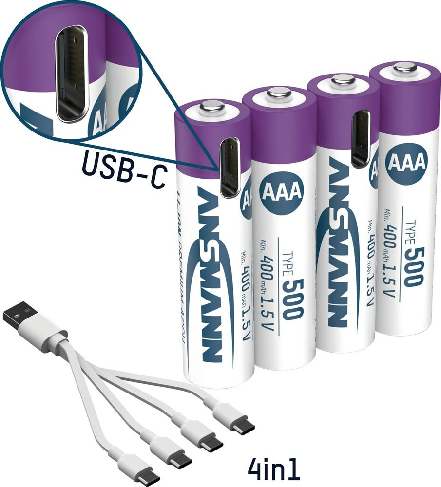 4x Micro AAA Li-Ion Akku 500 mAh, 4 in 1 USB-C Ladekabel