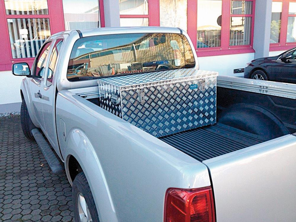 · Stabile Transportbox mit abgeschrägtem Deckel aus 3 mm starkem Aluminium-Riffelblech für den Aufbau auf Transporter-Pritschen u. ä. ∙ Rundum geschweißte Nähte und umlaufende Gummidichtung ∙ Gasdruckdämpfer zum einfachen Öffnen und Offenhalten des Deckels ∙ Selbsteinklappende Tragegriffe mit Kunststoffmantel ∙ Edelstahl-Exzenterverschlüsse mit Öse für Vorhangschloss ∙ An der Unterseite 4 Befestigungs-Füße mit M 10 Innengewinde ∙ Vorrichtung für Werkzeugablage