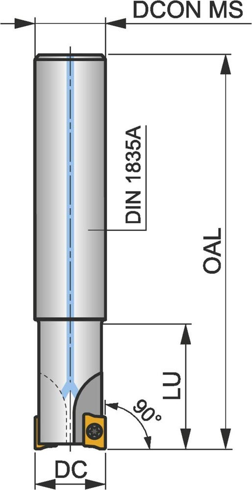 Eckfräser mit positiver/negativer Geometrie zum spannen von 2 Stück ADMX 1606.. oder ADEX 1606.. einseitigen Wendeschneidplatten · Schnittdurchmesser 25mm mit 90° Anstellwinkel und 25mm Zylinderschaft gemäß DIN 1835A · 33mm Funktionslänge 165mm Gesamtlänge · Kühlkanalbohrung zum Kopierfräsen · flachen Schulterfräsen · flachen Nutfräsen · Rampen · Helikalen Fräsen · Tauchfräsen und progressiven Eintauchen mit einer maximalen Schnitttiefe von 13.0mm