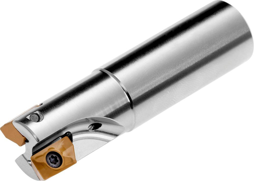 Eckfräser mit positiver/negativer Geometrie zum spannen von 3 Stück ADMX 1606.. oder ADEX 1606.. einseitigen Wendeschneidplatten · Schnittdurchmesser 40mm mit 90° Anstellwinkel und 32mm Weldon Schaft gemäß DIN 1835B · 50mm Funktionslänge 110mm Gesamtlänge · Kühlkanalbohrung zum Kopierfräsen · flachen Schulterfräsen · flachen Nutfräsen · Rampen · Helikalen Fräsen · Tauchfräsen und progressiven Eintauchen mit einer maximalen Schnitttiefe von 13.0mm