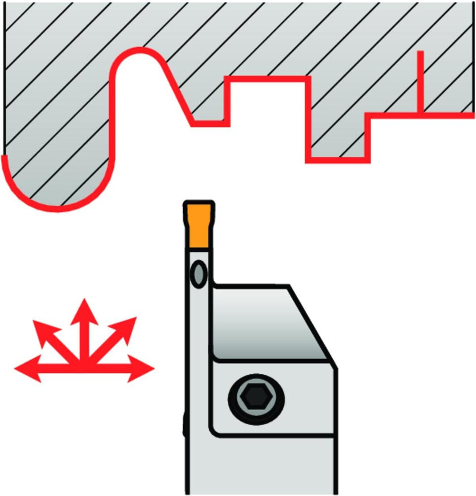 GL2-A1616KFR-16-45 ist ein außen Rechter-Werkzeughalter mit innerer Kühlmittelzufuhr für GL-Wendeschneidplatten · das für Langdrehautomaten entwickelt wurde und einen einfachen Zugang zum Klemmen der Wendeschneidplatte bietet. Geeignet zum Radialstechen · Abstechen · Drehen und Profilieren.Körper für längere Standzeit oberflächenbehandelt.