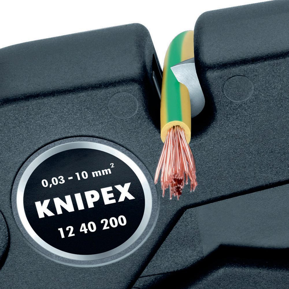 selbsteinstellend · für ein-, mehr- und feindrähtige Leiter mit Kunststoff- oder Gummiisolation · Drahtschneider für Cu- und Al-Leiter mehrdrähtig bis 10 mm² und eindrähtig bis 6 mm² · Messer und Kunststoff-Klemmbacken leicht auswechselbar · Gehäuse: aus glasfaserverstärktem Kunststoff · Messer: Spezial-Werkzeugstahl, ölgehärtet