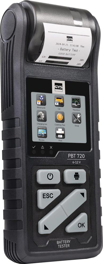 professioneller Batterietester mit Farbdisplay und integriertem Drucker · ultrapräzise Messung für 6 V, 12 V und 24 V Batterien, Starter und Lichtmaschinen · automatische Temperaturkompensation · dynamische Widerstandsmessung · 3,2-Zoll-Farbdisplay · 13 Bedienersprachen · Verpolungsschutz · PC-Anbindung · geeignet für alle gängigen Bleibatterien (VRLA, GEL, AGM, EFB, Standard) von 7 bis 240 Ah