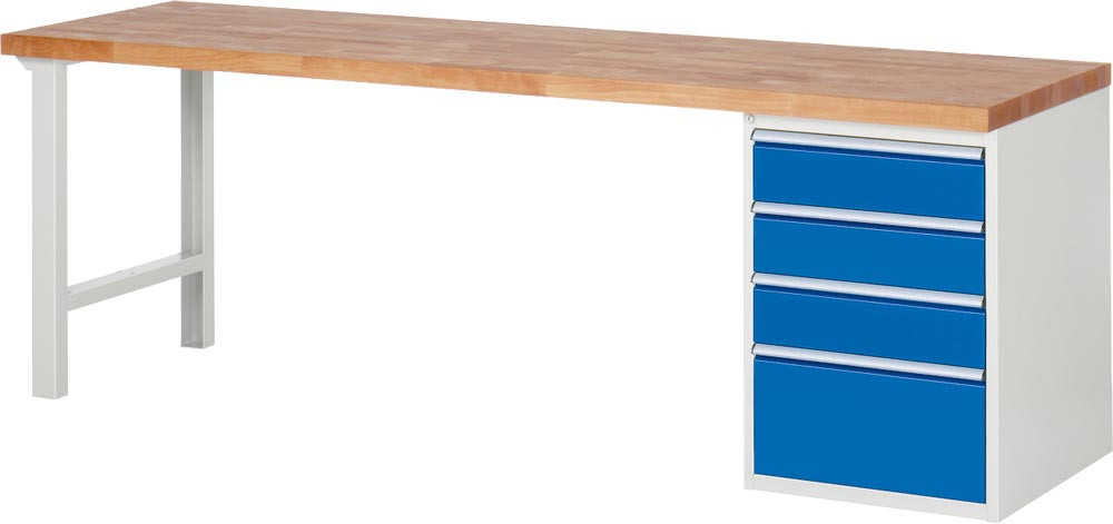 Baukastenwerkbank, Platte Buche 40 mm, 4 Schubladen: 3x150 mm, 1x270 mm, BxTxH 2500x700x890 mm, RAL 7035/5010