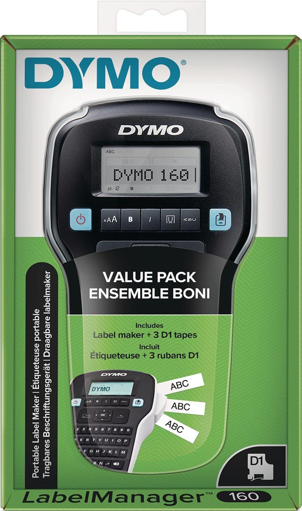 mobiles Beschriftungsgerät mit drei original DYMO®-Schriftbändern (12 mm x 7m, schwarz auf weiß) · der LabelManager™ 160 druckt schnell und unkompliziert jedes Etikett · Abschaltautomatik · Betrieb mit Batterien (6 x AA nicht im Lieferumfang), Nachhaltig produziert und verpackt