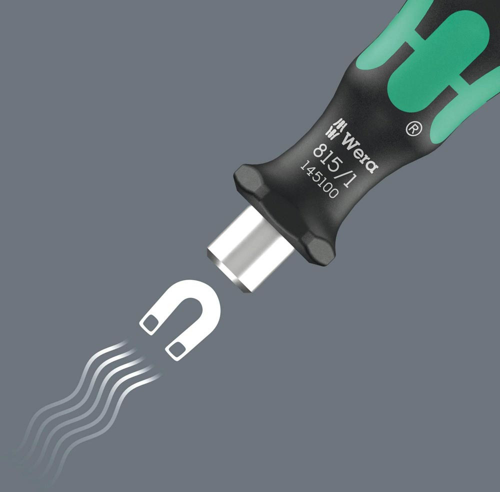 Hochwertiger Bit-Handhalter. Der Magnet sorgt für den sicheren Sitz des Bits im Halter. Kraftform Plus Griff für angenehm ergonomisches Arbeiten · bei dem Blasen und Schwielen vermieden werden. Harte Griffzonen für hohe Arbeitsgeschwindigkeit · während weiche Griffzonen hohe Drehmomentübertragung garantieren. Geeignet für Bits mit 1/4″-Außensechskantantrieb nach DIN ISO 1173-C 6,3 und E 6,3 sowie Wera Anschluss-Reihen 1 und 4.