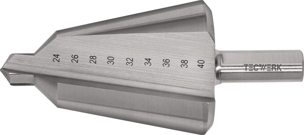 Schaft mit 3 Spannflächen · mit 2 Schneiden · Senkwinkel 20 ° · konisch ansteigende Schneiden radial hinterschliffen, dadurch wird ein schälender Schnitt erzielt · Universalwerkzeug mit breitem Anwendungsbereich, besonders für die Blechbearbeitung, aber auch für Kunststoffe geeignet · auf jeder Bohrmaschine verwendbar