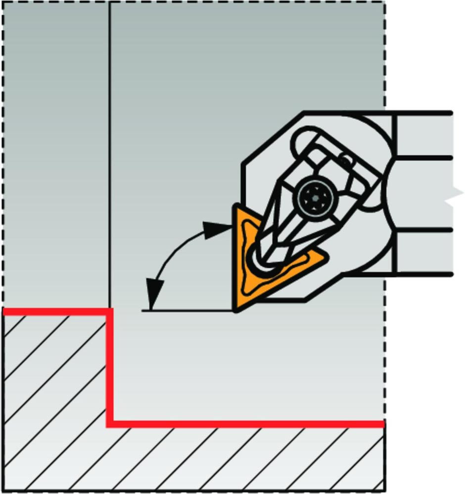 Dreh-Bohrstange doppelt geklemmt zum spannen von Triangular negative Wendeschneidplatten mit einem Innenkreisdurchmesser von 9.525mm · 4.76mm Dick (ISO Bezeichnung TN.. 1604.. ) · linke Ausführung zum 90° Längsdrehen mit abgesetzem Schaft · Stahl mit Kühlkanalbohrung · 25mm Durchmesser x 300mm Länge für Innenentgraten · Innenkegeldrehen und Längsdrehen ohne Schulter