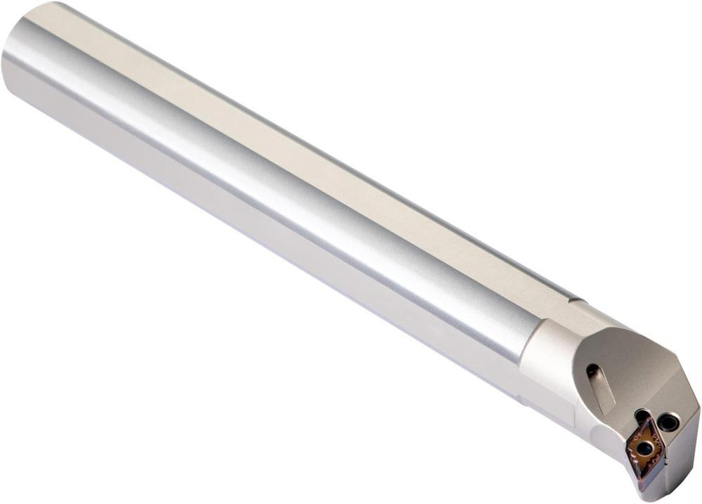 Dreh-Bohrstange mit Kniehebelklemmung zum spannen von 55° Rhombus negative Wendeschneidplatten mit einem Innenkreisdurchmesser von 15.875mm · 6.35mm Dick (ISO Bezeichnung DN.. 1506.. ) · rechte Ausführung zum 93° Längsdrehen mit abgesetzem Schaft · Stahl mit Kühlkanalbohrung · 40mm Durchmesser x 300mm Länge für Innenkegeldrehen · Kopierdrehen in einer und mehreren Richtungen und Längsdrehen mit und ohne Schulter