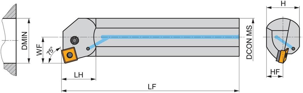 Dreh-Bohrstange mit Kniehebelklemmung zum spannen von Viereckig negative Wendeschneidplatten mit einem Innenkreisdurchmesser von 19.05mm · 6.35mm Dick (ISO Bezeichnung SN.. 1906.. ) · rechte Ausführung zum 75° Längsdrehen mit abgesetzem Schaft · Stahl mit Kühlkanalbohrung · 50mm Durchmesser x 350mm Länge für Innenkegeldrehen und Längsdrehen ohne Schulter
