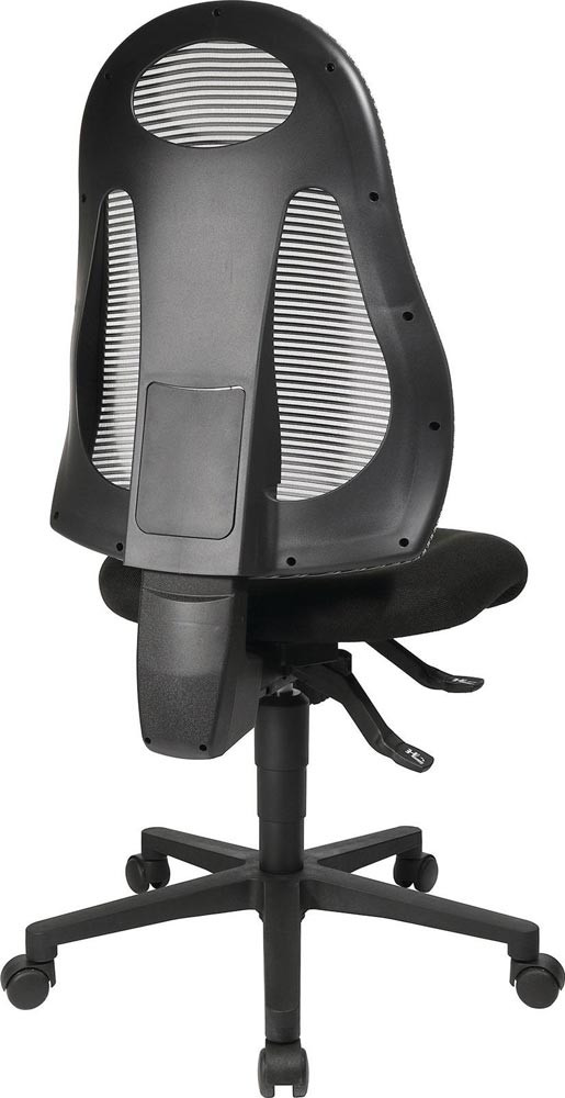 mit Synchron-Technik, (ohne Armlehnen) · für überwiegend sitzende Tätigkeiten · stabiles Polyamid Fußkreuz in schwarz · individuell auf das Körpergewicht einstellbar und arretierbar · bequemer Bandscheibensitz zur optimalen Abstützung im Beckenbereich · Rückenlehne mit atmungsaktivem Elastan-Netzgewebe 100 % Polyester, in Höhe und Neigung verstellbar · stufenlose Sitzhöhenverstellung · Sitzbezug schwarz aus 100 % Polypropylen · Sitzfläche B 500 x T 500 mm · Lehnenhöhe 620-690 mm · Rollen für weiche Böden Lieferung erfolgt zerlegt