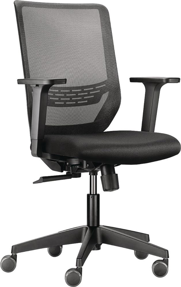 mit Synchrontechnik (mit Armlehnen) · für überwiegend sitzende Tätigkeiten · stabiles Kunststofffußkreuz, schwarz ∙ Rückenlehne mit Lumbalstütze ∙ Lumbalstütze stufenlos höhenverstellbar (60mm) zur Unterstützung des unteren Rückens ∙ mit hoher atmungsaktiver Netzrückenlehne · stufenlose Sitzhöhenverstellung ∙ Armlehnen höhen- und breitenverstellbar mit PU-Soft-Auflagen ∙ Polster 100 % Polyester, Netzbezug 100 % Polyester · Sitzfläche B 450 x T 460 mm · Lehnenhöhe 570 mm · Universalrollen für weiche und harte Böden · Lieferung erfolgt zerlegt