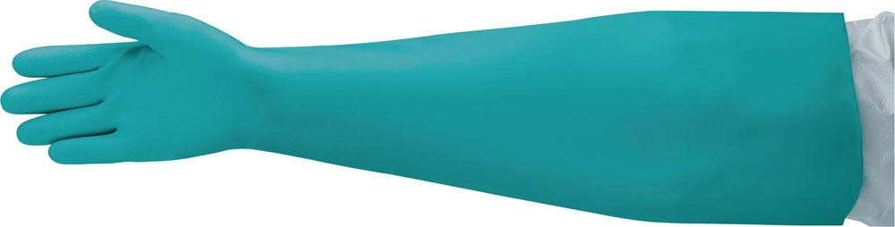nach EN 388 · EN 374 · Kat. III · Material: Nitril · Vollarmabdeckung für einen erhöhten Chemikalienschutz · exzellenter Nass-/Trockengriff · größere Fingerbeweglichkeit und geringere Handermüdung · weit geschnittene Stulpe für ein Tragen über Schutzkleidungsärmeln · silikonfrei · latexfrei · lebensmitteleignet · Anwendung: Lackieren und Reinigen von Werkzeugen und Robortern, Umfüllen von Flüssigkeiten und Feststoffen, Befüllen/Leeren von Prozessanlagen