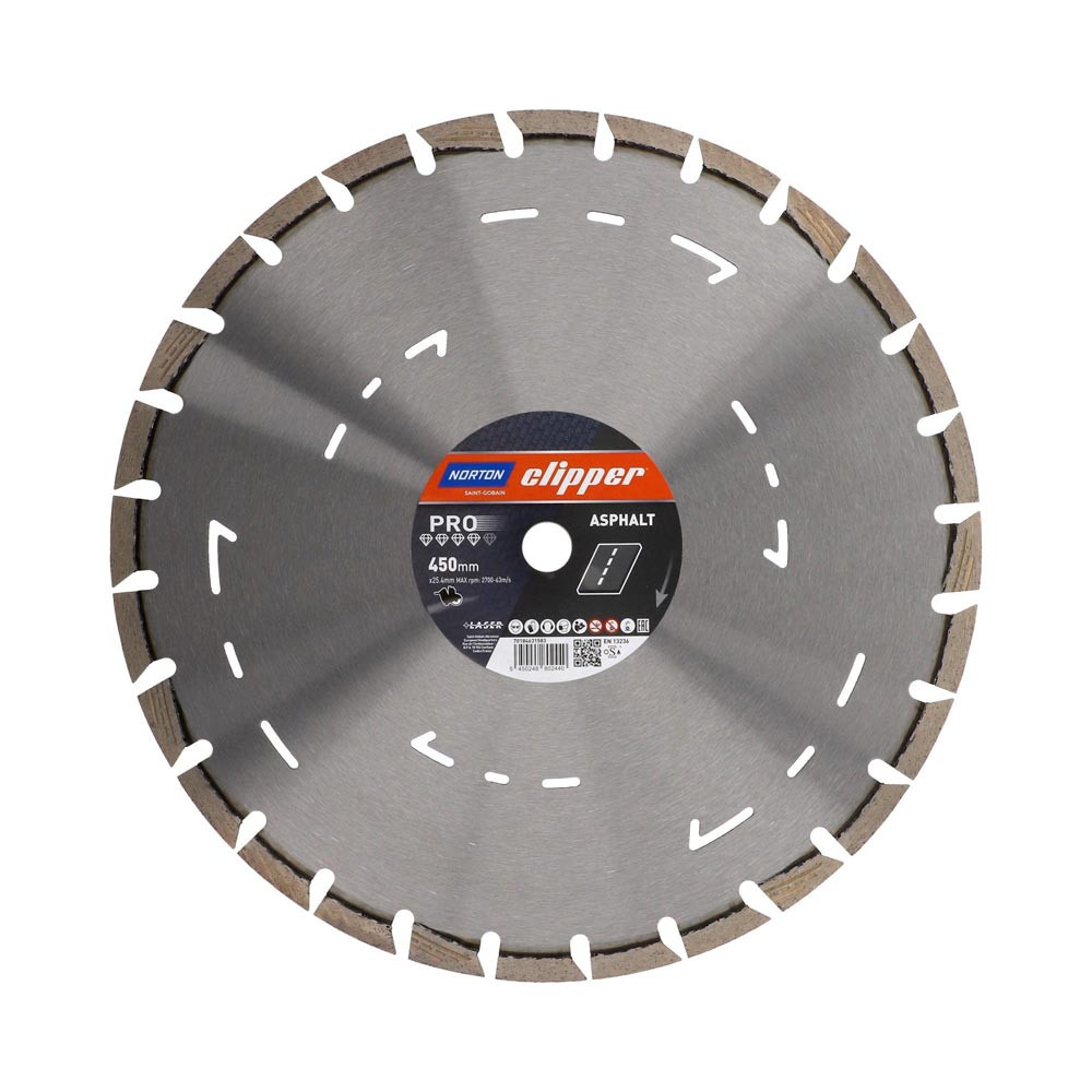 exzellente Standzeit, auch bei intensivstem Gebrauch, dank 12 mm hohen, lasergeschweißte Segmenten · mit patentiertem Schnitttiefenanzeiger, der Abnutzung und korrekte Drehrichtung anzeigt (bis Ø 450 mm) · Spezial-Schrägsegmente dienen als Unterschnittschutz und verhindern ein vorzeitiges Abnutzen des Blattes