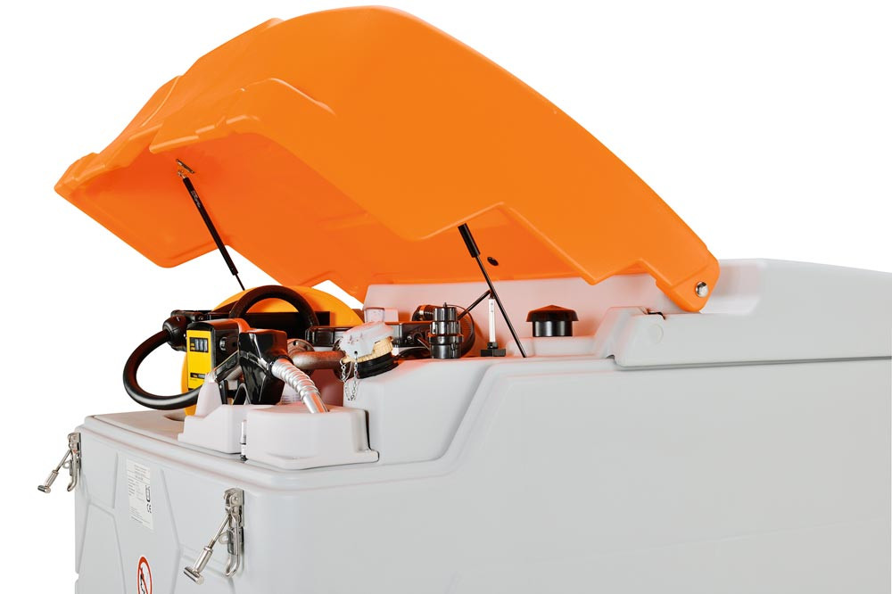 ∙ Mit integrierter Auffangwanne ∙ Optische Leckageanzeige ∙ Befüllanschluss mit TW-Kupplung und Grenzwertgeber ∙ Entlüftungsklappe ∙ Füllstandsanzeiger ∙ Elektrische Pumpe 230 V, 56 l/min ∙ Automatik Zapfpistole und Zapfpistolenhalter