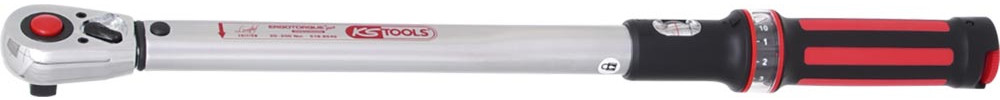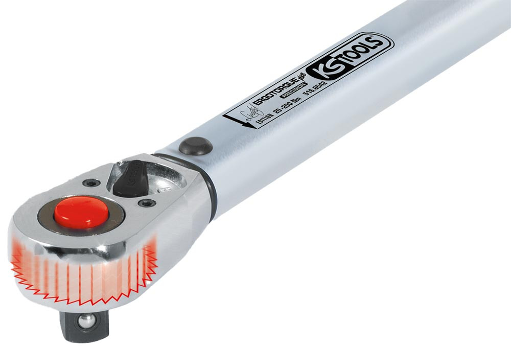 Profi-Drehmomentschlüssel mit robustem 36-Zahn-Ratschenmechanismus ∙ Deutlich hör- und fühlbare Drehmomentauslösung durch Kurzwegauslösung ∙ Gut ablesbare Doppel-Skala Nm/lbf∙ft ∙ Sichtfenster mit Lupeneffekt ∙ Auslösegenauigkeit ± 3% Toleranz von eingestellten Wert ∙ Linksanzugssperre - unbegrenztes Lösemoment ohne Drehmomentfunktion ∙ Ergonomischer 2-Komponenten-Handgriff ∙ Länge 500 mm ∙ Lieferung mit Prüfzertifizierung nach DIN/EN/ISO