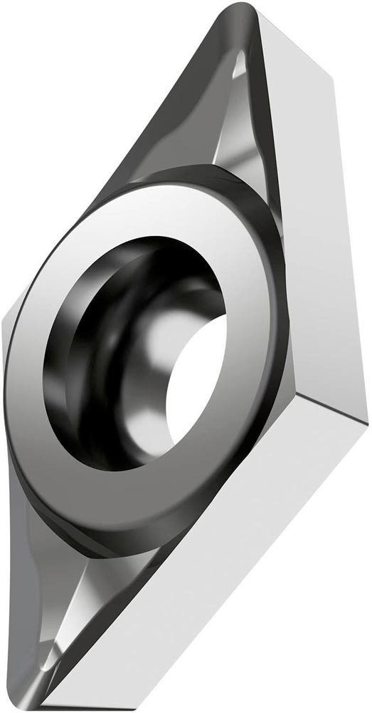 Einseitige positive Drehwendeschneidplatte · 55° Rhombisch mit 7° Freiwinkel · Innenkreisdurchmesser von 9.525mm · 3.97mm Dick · 0.4mm Radius · Indexgenauigkeit nach ISO-Toleranzklasse-G · Spanbrecher AL mit scharfer Schneidkante · im Substrat T0315 · PVD beschichtet WC-Co Feinkornsubstrat im ISO-Bereich N05 -N20 · zum schlichten bis schruppen bearbeiten von Nichteisenmetallen