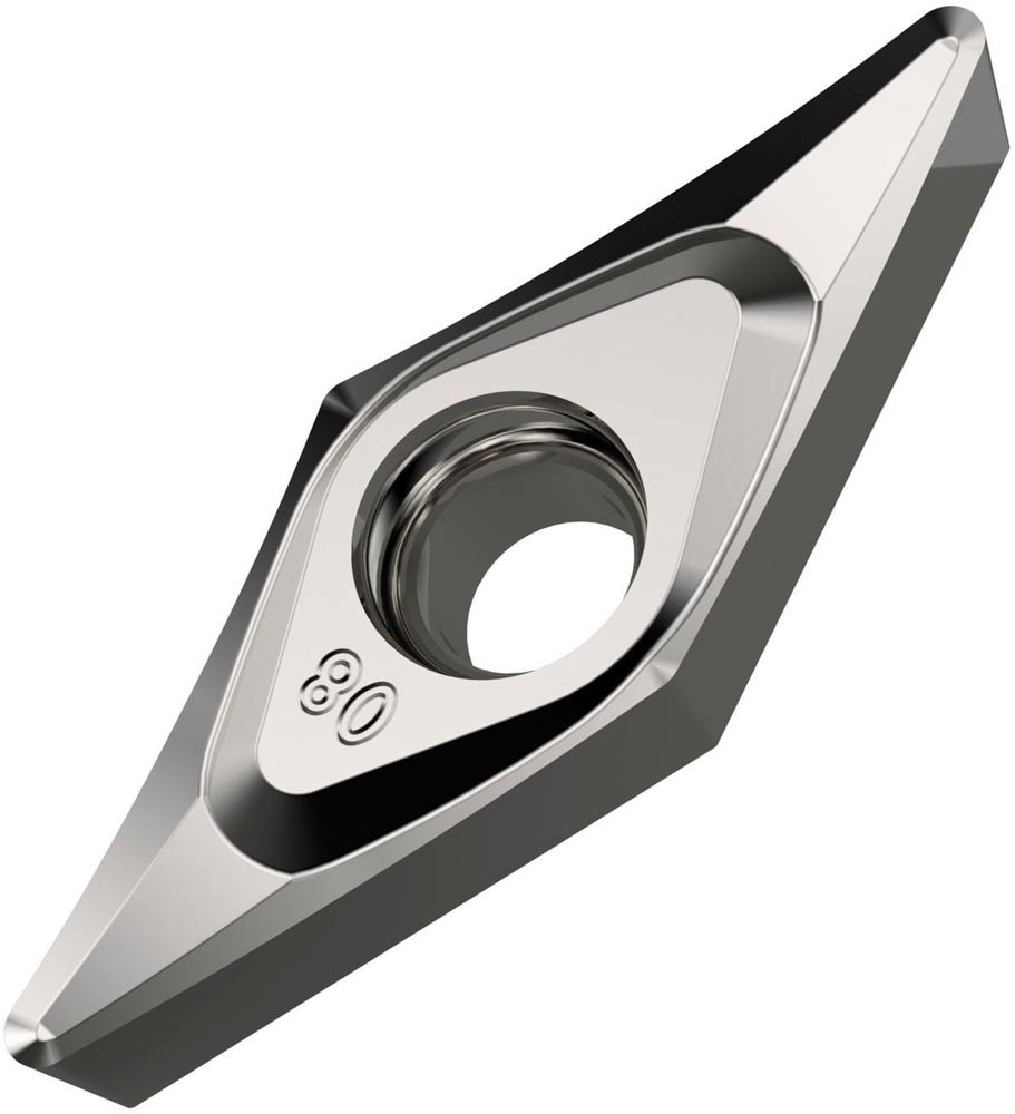 Einseitige positive Drehwendeschneidplatte · 35° Rhombisch mit 7° Freiwinkel · Innenkreisdurchmesser von 7.94mm · 3.18mm Dick · 0.4mm Radius · Indexgenauigkeit nach ISO-Toleranzklasse-G · Spanbrecher SF3 mit verrundeter Schneidkante · im Substrat H07 · unbeschichtet WC-Co Substrat in den ISO-Bereichen N10 -N30 und S01 -S20 · zum schlichten bis medium bearbeiten von Nichteisenmetallen und Superlegierungen
