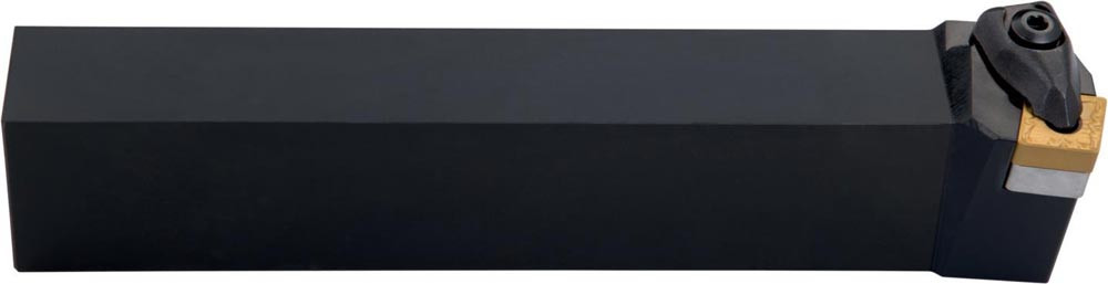 Dreh-Trägerwerkzeug doppelt geklemmt zum spannen von 80° Rhombus negative Wendeschneidplatten mit einem Innenkreisdurchmesser von 12.7mm · 4.76mm Dick (ISO Bezeichnung CN.. 1204.. ) · linke Ausführung zum 75° Längsdrehen mit abgesetzem Schaft · 25mm Werkzeughöhe x 25mm Breite x 150mm Länge für Stirndrehen ohne Schulter