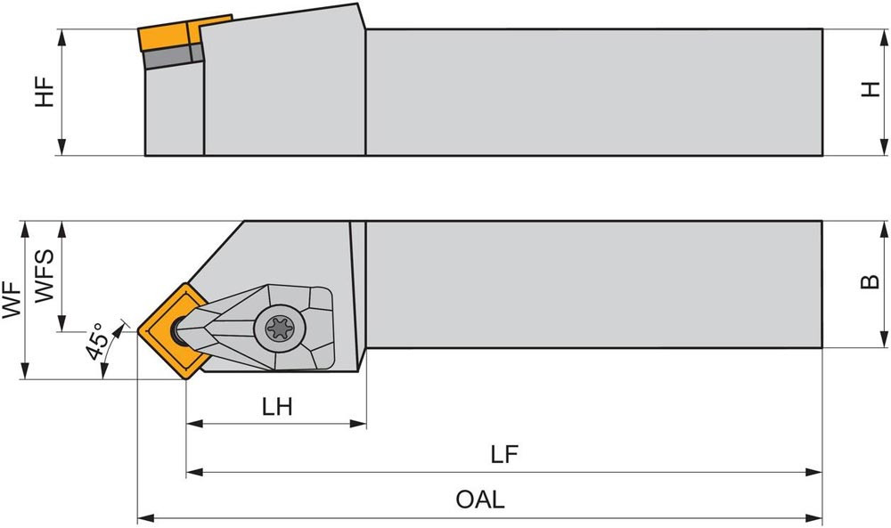 Dreh-Trägerwerkzeug doppelt geklemmt zum spannen von Viereckig negative Wendeschneidplatten mit einem Innenkreisdurchmesser von 15.875mm · 6.35mm Dick (ISO Bezeichnung SN.. 1506.. ) · rechte Ausführung zum 45° Stirndrehen mit abgesetzem Schaft · 32mm Werkzeughöhe x 25mm Breite x 170mm Länge für entgraten · Kegeldrehen · Kopierdrehen in einer und mehreren Richtungen · Stirndrehen ohne Schulter und Längsdrehen ohne Schulter
