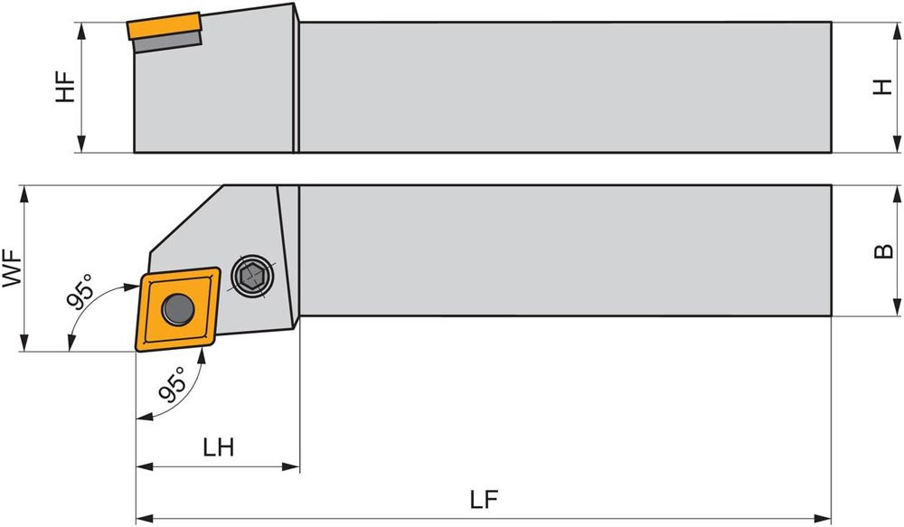 Dreh-Trägerwerkzeug mit Kniehebelklemmung zum spannen von 80° Rhombus negative Wendeschneidplatten mit einem Innenkreisdurchmesser von 15.575mm · 6.35mm Dick (ISO Bezeichnung CN.. 1606.. ) · rechte Ausführung zum 95° Stirn-und Längsdrehen mit abgesetzem Schaft · 32mm Werkzeughöhe x 25mm Breite x 170mm Länge für Kegeldrehen · Stirndrehen mit und ohne Schulter und Längsdrehen mit und ohne Schulter