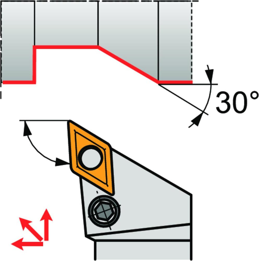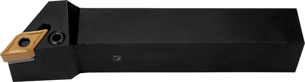 Dreh-Trägerwerkzeug mit Kniehebelklemmung zum spannen von 55° Rhombus negative Wendeschneidplatten mit einem Innenkreisdurchmesser von 12.7mm · 6.35mm Dick (ISO Bezeichnung DN.. 1506.. ) · rechte Ausführung zum 93° Stirndrehen mit abgesetzem Schaft · 32mm Werkzeughöhe x 25mm Breite x 170mm Länge für Kegeldrehen · Kopierdrehen in einer und mehreren Richtungen und Längsdrehen mit und ohne Schulter