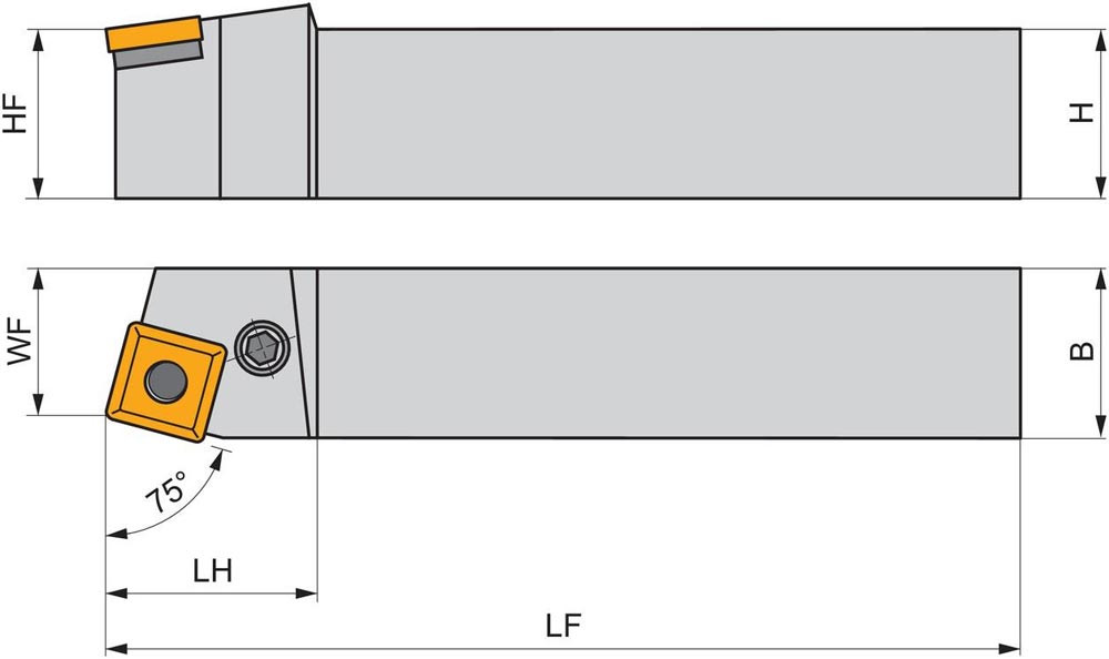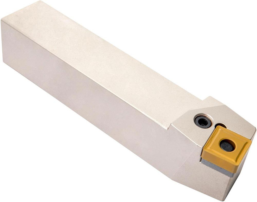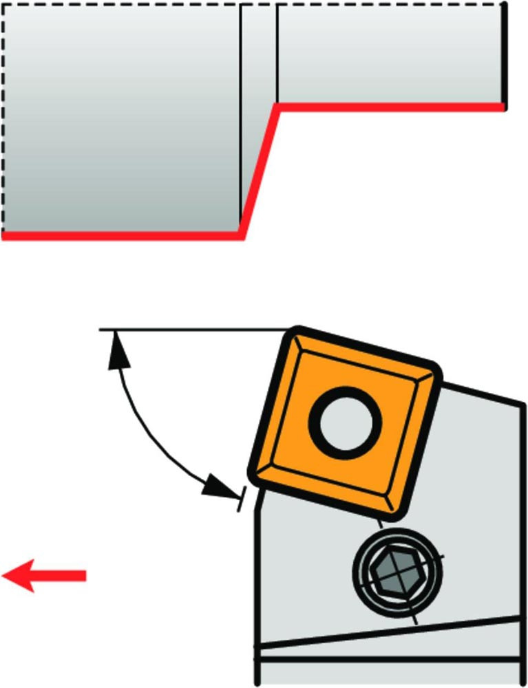 Dreh-Trägerwerkzeug mit Kniehebelklemmung zum spannen von Viereckig negative Wendeschneidplatten mit einem Innenkreisdurchmesser von 12.7mm · 4.76mm Dick (ISO Bezeichnung SN.. 1204.. ) · linke Ausführung zum 75° Stirndrehen mit Zylinderschaft · 25mm Werkzeughöhe x 25mm Breite x 150mm Länge für Kegeldrehen und Längsdrehen ohne Schulter