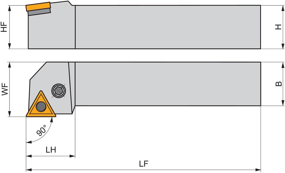 Dreh-Trägerwerkzeug mit Kniehebelklemmung zum spannen von Triangular negative Wendeschneidplatten mit einem Innenkreisdurchmesser von 12.7mm · 4.76mm Dick (ISO Bezeichnung TN.. 2204.. ) · rechte Ausführung zum 90° Stirndrehen mit abgesetzem Schaft · 32mm Werkzeughöhe x 32mm Breite x 170mm Länge für Kegeldrehen und Längsdrehen ohne Schulter