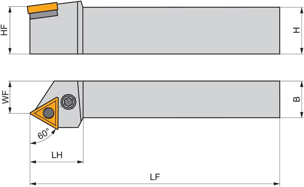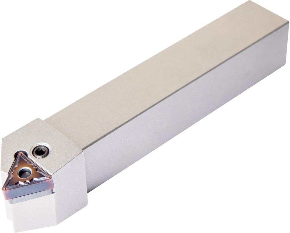 Dreh-Trägerwerkzeug mit Kniehebelklemmung zum spannen von Triangular negative Wendeschneidplatten mit einem Innenkreisdurchmesser von 9.525mm · 4.76mm Dick (ISO Bezeichnung TN.. 1604.. ) · rechte Ausführung zum 60° Stirndrehen mit abgesetzem Schaft · 25mm Werkzeughöhe x 25mm Breite x 150mm Länge für Kegeldrehen und Kopierdrehen in einer und mehreren Richtungen