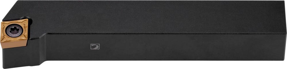 Dreh-Trägerwerkzeug mit Schraubklemmung zum spannen von 80° Rhombus positive Wendeschneidplatten mit einem Innenkreisdurchmesser von 9.525mm · 3.97mm Dick (ISO Bezeichnung CC.. 09T3.. ) · rechte Ausführung zum 90° Längsdrehen mit abgesetzem Schaft · 16mm Werkzeughöhe x 16mm Breite x 100mm Länge für Stirndrehen mit und ohne Schulter