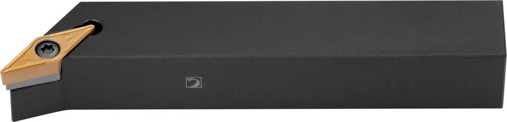 Dreh-Trägerwerkzeug mit Schraubklemmung zum spannen von 35° Rhombus positive Wendeschneidplatten mit einem Innenkreisdurchmesser von 9.525mm · 4.76mm Dick (ISO Bezeichnung VB.. 1604.. oder VC.. 1604.. ) · rechte Ausführung zum 107°30' Stirndrehen mit abgesetzem Schaft · 25mm Werkzeughöhe x 25mm Breite x 150mm Länge für Kegeldrehen · Kopierdrehen in einer und mehreren Richtungen und Längsdrehen mit und ohne Schulter