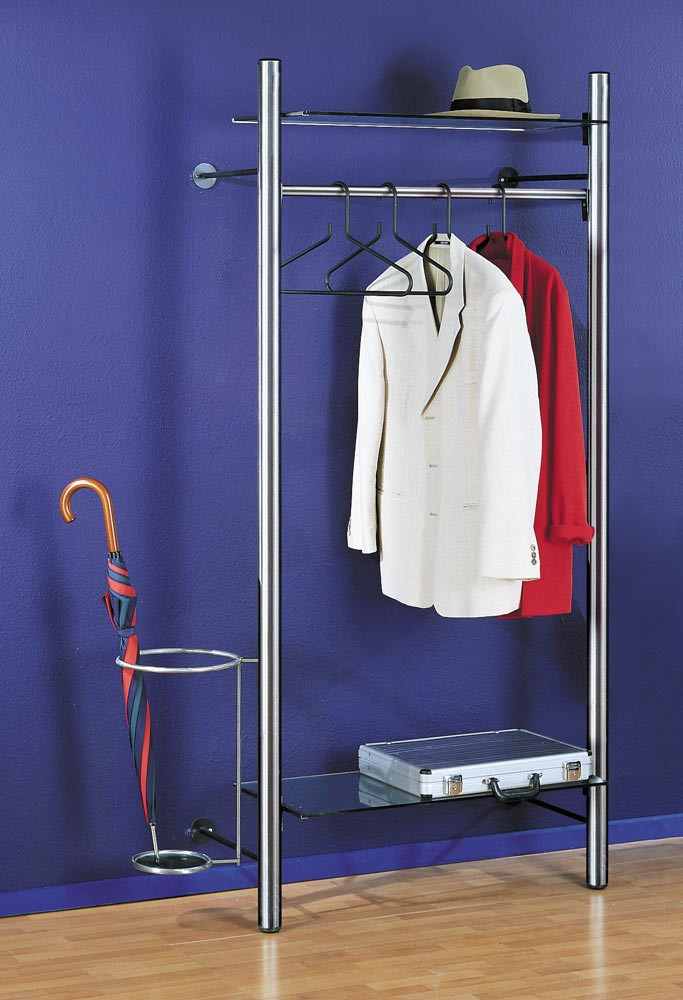 Edelstahl-Wandgarderobensystem, Grundelement, Kleiderbügelstange, 2 Glasböden aus Sicherheitsglas, BxTxH 845x400x1900 mm E856489