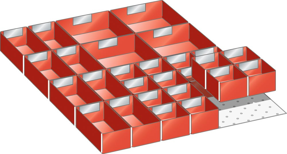 Einsatzkästen, Fronthöhe 75 mm, 16 Kästen 75x75 mm, 8 Kästen 150x75 mm, 4 Kästen 150x150 mm, Schubladennutzgröße BxT 459x612 mm E876170