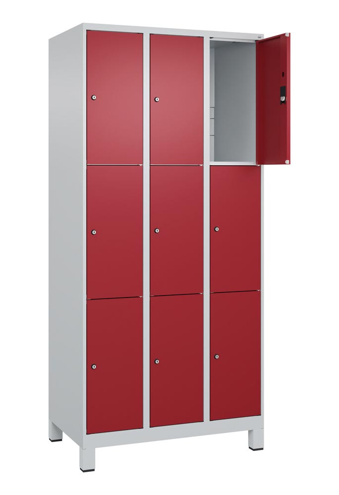 Fächerschrank, BxTxH 900x500x1950 mm, 3x3 Fächer, Abt.B 300 mm, Füße, Schloss, glatte Türen, Farbwahl