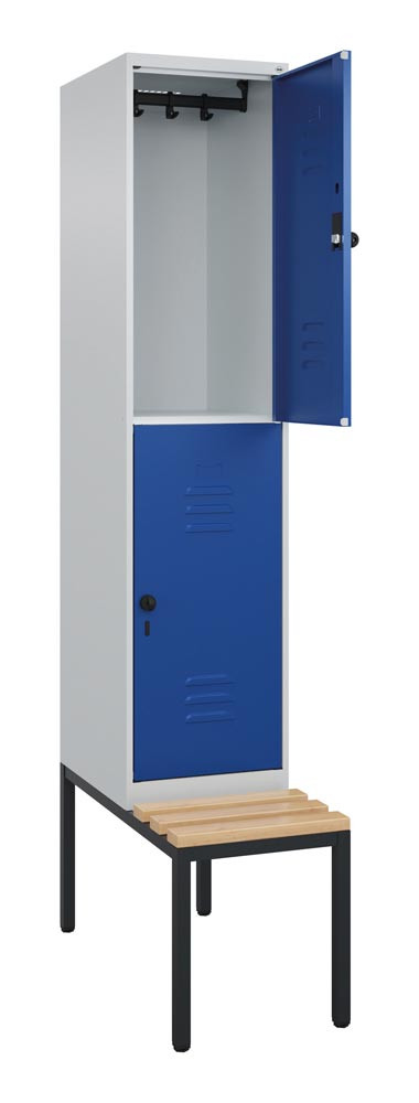 Fächerschrank, untergeb. Sitzbank, BxTxH 400x500x2120 mm, 1x2 Fächer, Abt.B 400 mm, doppelstöckig, Bucheleisten, Drehriegel, RAL 7035/5010 E6479165