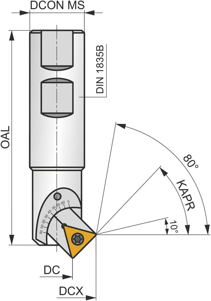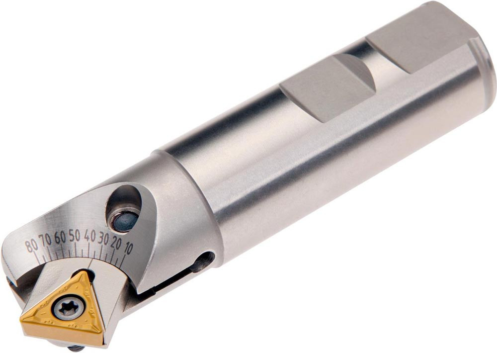 Entgratfräser mit doppelt negativer Geometrie zum spannen von 1 Stück TCMT 16T304E-FM:T83.. oder TCMT 16T308E-FM:T83.. einseitigen Wendeschneidplatten · Schnittdurchmesser 5 bis maximal 31mm mit 10 -80° Anstellwinkel und 25mm Weldon Schaft gemäß DIN 1835B · 100mm Gesamtlänge zum Entgratfräsen mit einer maximalen Schnitttiefe von 8.5mm