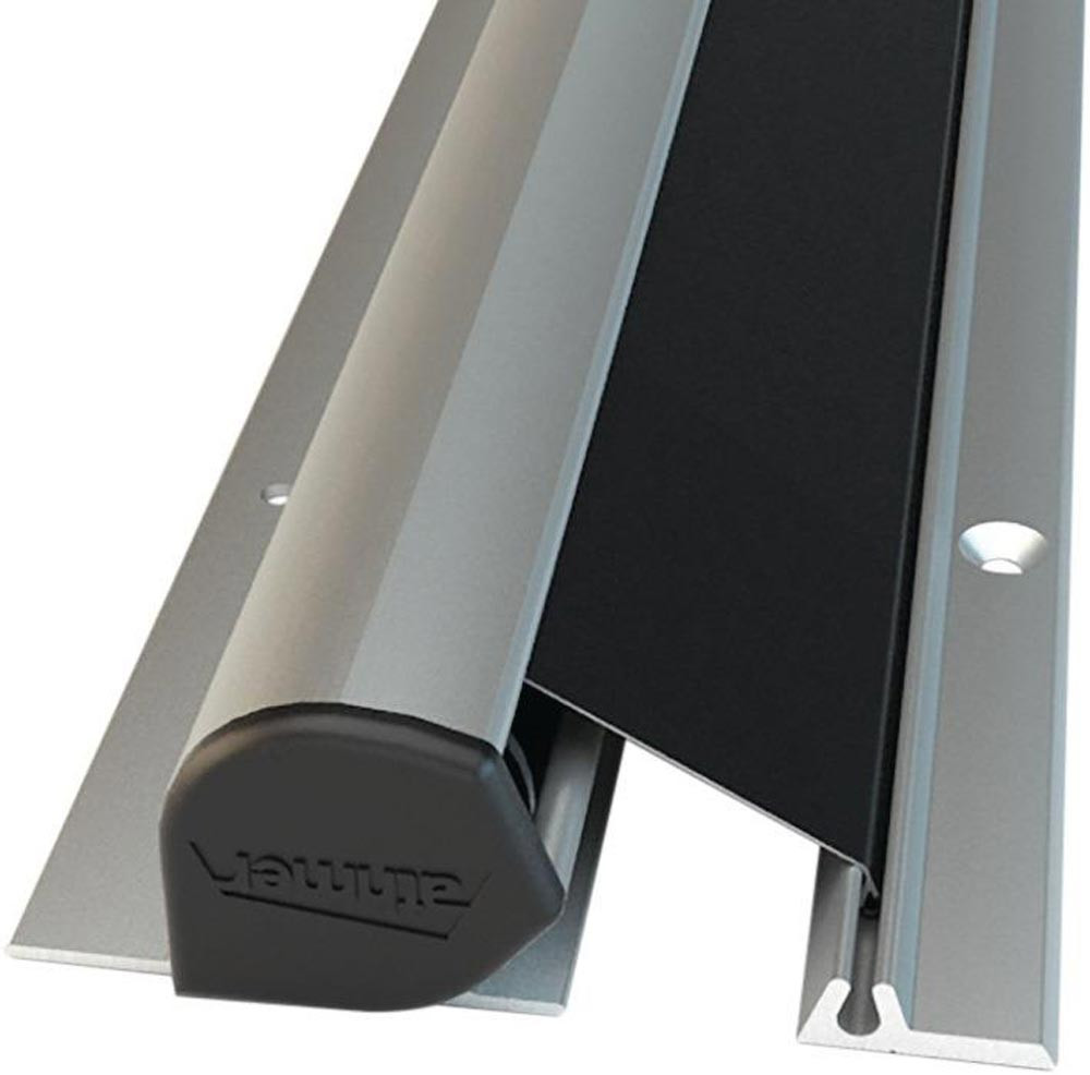 selbsttätig auf konstante Spannung ziehendes Schutzrollo · Bandgegenseite · Profil: Aluminium · Abdeckung: Kunstfaser · Farbe: schwarz · feuerhemmend ausgerüstet · abwaschbar · wartungsfrei