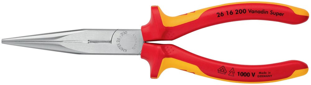 mit Schneide (Storchenschnabelzange) · VDE-isoliert bis 1000 V · gefertigt gem. DIN EN/IEC 60900, stückgeprüft · gerade, flachrunde, lange, spitz zulaufende Backen · Greifflächen gezahnt · verwindungstolerante, elastische Präzisionsspitzen · Schneiden zusätzlich gehärtet, Schneidenhärte ca. 61 HRC · Vanadin-Elektrostahl, geschmiedet, mehrstufig ölgehärtet