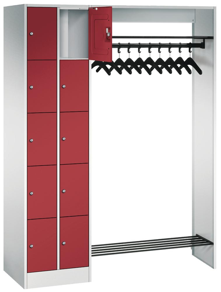 Schließfachschränke mit 5 Fächern übereinander bieten in Kombination mit funktionalen Garderobeneinheiten für 5, 10, 15 oder 20 Personen ausreichend Platz für Kleidung und persönliche Dinge.
