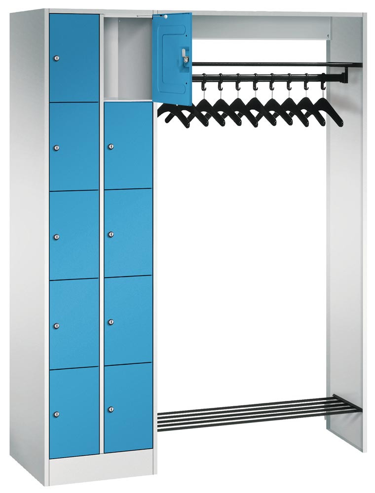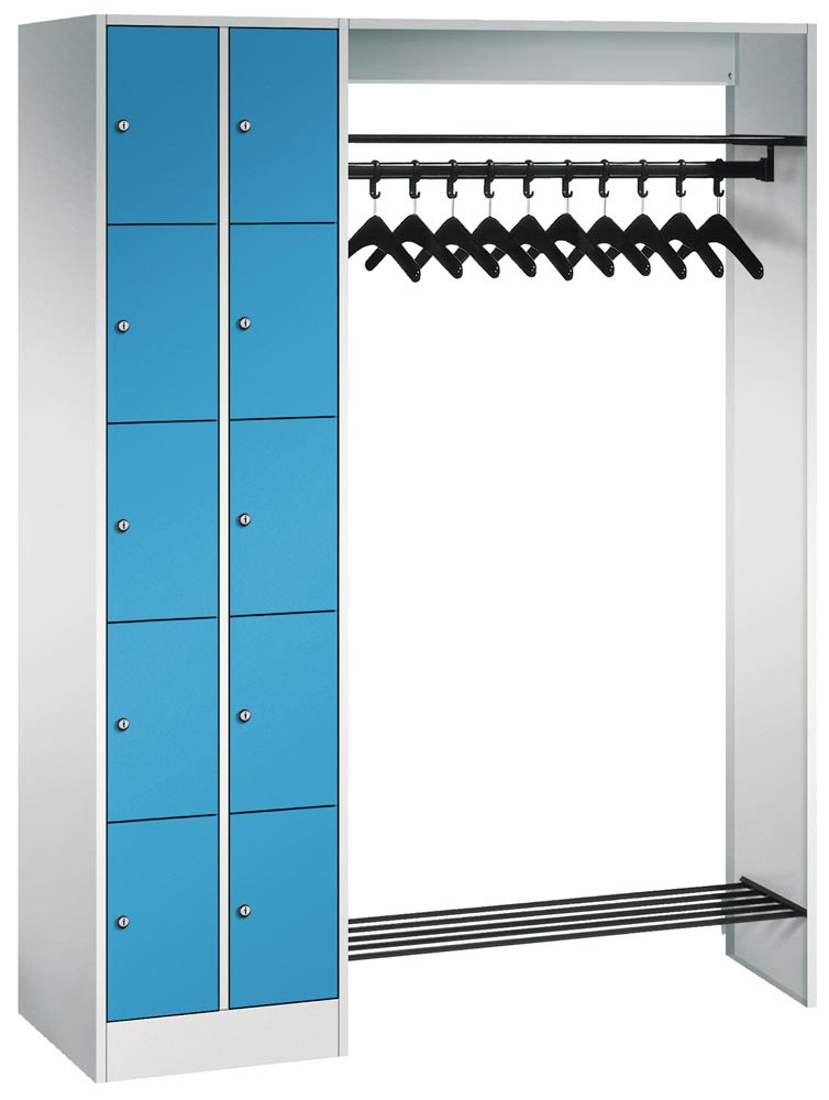 Schließfachschränke mit 5 Fächern übereinander bieten in Kombination mit funktionalen Garderobeneinheiten für 5, 10, 15 oder 20 Personen ausreichend Platz für Kleidung und persönliche Dinge.