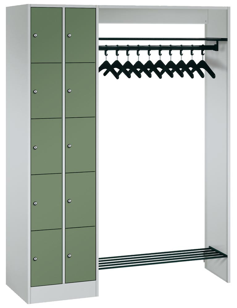 Schließfachschränke mit 5 Fächern übereinander bieten in Kombination mit funktionalen Garderobeneinheiten für 5, 10, 15 oder 20 Personen ausreichend Platz für Kleidung und persönliche Dinge.