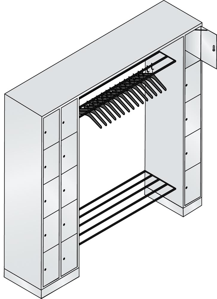 Schließfachschränke mit 5 Fächern übereinander bieten in Kombination mit funktionalen Garderobeneinheiten für 5, 10, 15 oder 20 Personen ausreichend Platz für Kleidung und persönliche Dinge.