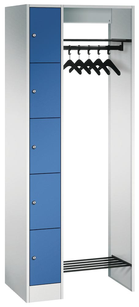 Schließfachschränke mit 5 Fächern übereinander bieten in Kombination mit funktionalen Garderobeneinheiten für 5, 10, 15 oder 20 Personen ausreichend Platz für Kleidung und persönliche Dinge.
