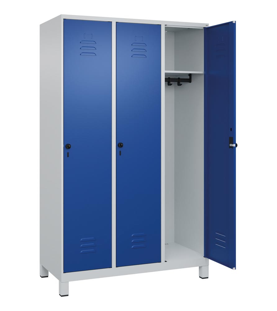 Garderobenschrank, BxTxH 1200x500x1950 mm, 3 Abteile, B 400 mm, Füße, Drehriegel, RAL 7035/5010
