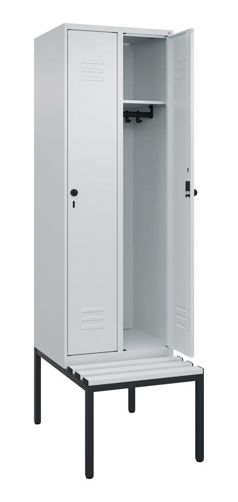 Garderobenschrank, untergeb. Sitzbank, BxTxH 600x500x2120 mm, 2 Abteile, Abt.B 300 mm, Kunststoffleisten, Drehriegel, RAL 7035