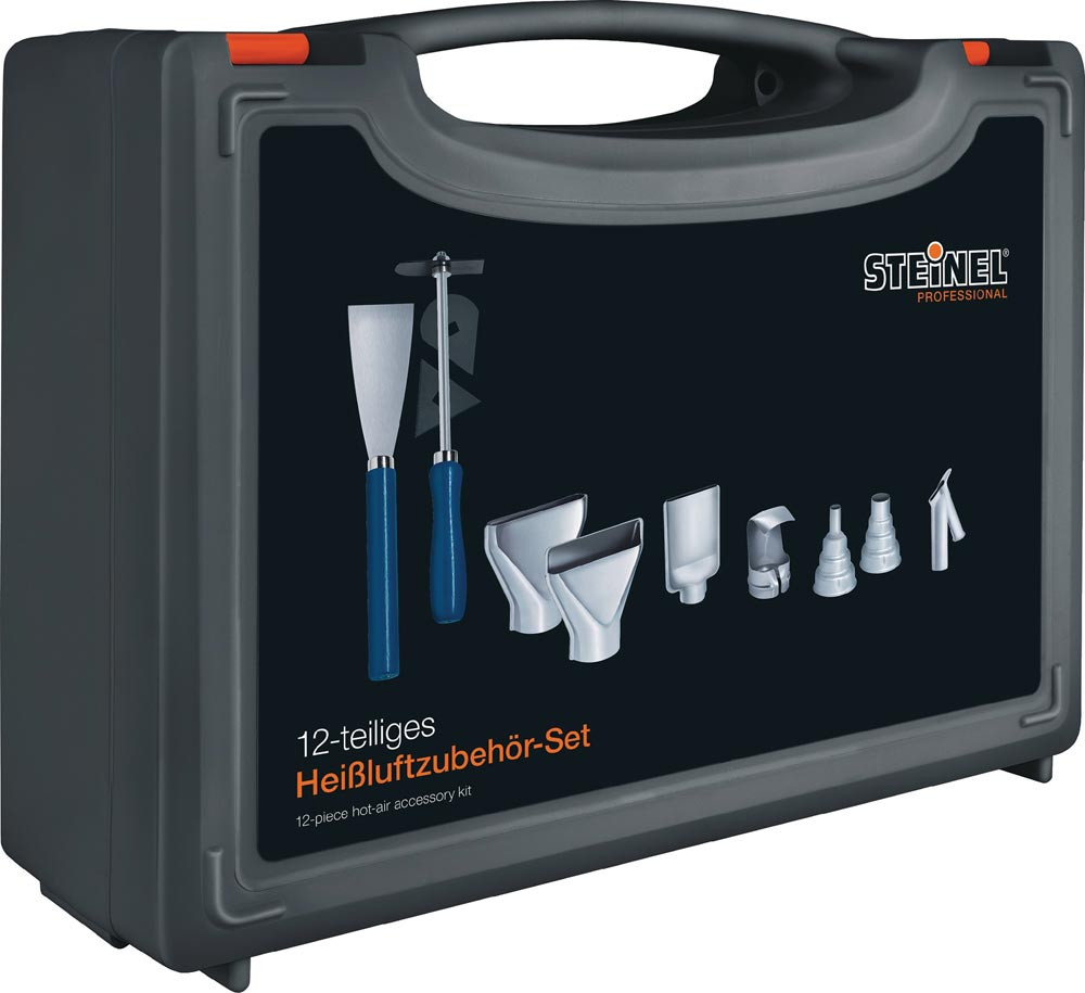12-teilig im Koffer · für alle typischen Heißluftanwendungen, wie Entfernen von Farbe, Schweißen von Planen, Verschweißen von Kunststoffen, Schrumpfen von Kabelbäumen · punktuelles Erwärmen und Verformen sowie viele weitere Anwendungen