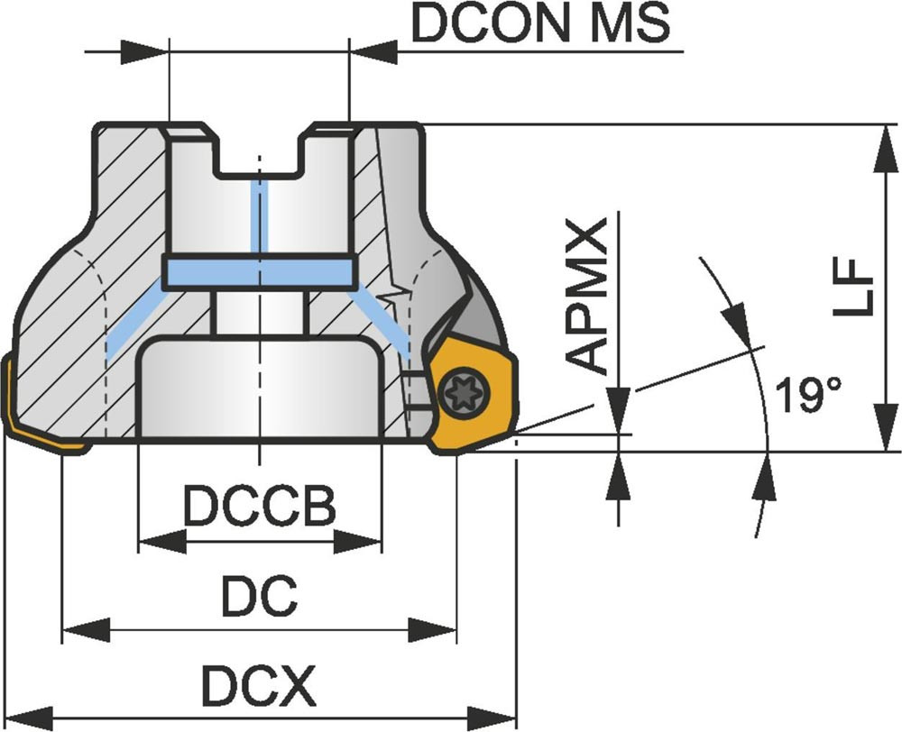Hochvorschubfräser mit positiver/negativer Geometrie zum spannen von 6 Stück PD.X 0905ZE.. · PDKT 0905.. oder PDMW 0905.. einseitigen Wendeschneidplatten · Schnittdurchmesser 66mm mit 19° Anstellwinkel und 22mm Verbindungsbohrung gemäß DIN 8030-A · 40mm Überstandslänge · Kühlkanalbohrung zum Planfräsen mit einer maximalen Schnitttiefe von 2.0mm