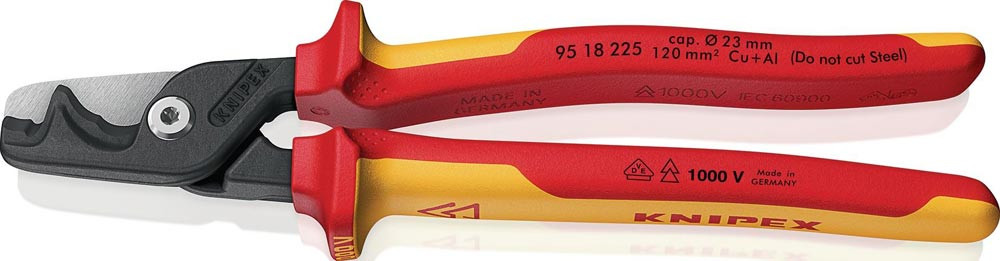 VDE-isoliert bis 1000 V · gefertigt gem. DIN EN/IEC 60900, stückgeprüft · mit Kraftgelenk · langen Schenkeln und optimierten Schneiden: bis zu 60 % leichterer Schnitt als mit kompakten Kabelscheren · enorme Kapazität: trennt eindrähtige Kabel aus Kupfer oder Aluminium bis 35 mm² · mehrdrähtig bis 70 mm² und feindrähtig bis 120 mm² · zwei Schneidbereiche: die abgestufte Hauptschneide hält kleinere und größere Kabel beim Schnitt stets maximal gelenknah · die Frontschneide dient zum schrittweisen Trennen („Knabbern”) sehr großer Kabel · komfortable Einhand- und Zweihandbedienung auch bei großen Kabeldurchmessern durch minimierte Schenkelweite · geschraubtes Kraftgelenk: hochübersetzt · leichtgängig · nachstellbar · schlanker Kopf für bessere Zugänglichkeit · mit Klemmschutz für sicheres Arbeiten · nicht geeignet für stahlverstärkte Kabel, etwa ACSR · Schneiden zusätzlich lasergehärtet · Schneidenhärte ca. 56 HRC